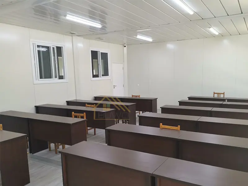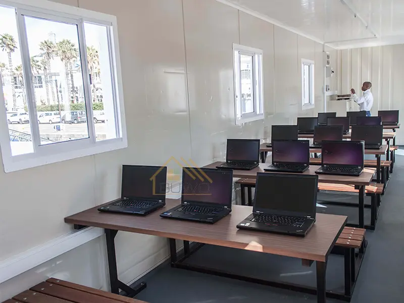 The arrangement of the portable container classroom interior could be designed according to standardization. All functions can be realized just like traditional school classrooms. For example, we can build teacher offices, cafeterias, students dormitories, computer rooms, libraries, chemical laboratories, bathrooms, washrooms, and other rooms.
